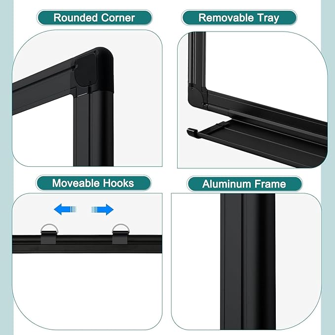- 【Double Sided】A double sided magnetic dry erase whiteboard offers plenty of space for organizing your ideas, each side of this whiteboard is suitable for being written on. It allows you to have two projects going. The white board is perfect for planning, home studies and meeting.