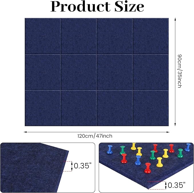 - EASY INSTALLATION & SAFE REMOVAL -Package contains 12 pieces of 11.8"x11.8"/30x30 cm, 0.35" thick high-density felt pin board, 48 pieces of double-sided safe-to-remove tape and a box damage-free to wall pin .felt cork board tiles are safe to be removed,without leaving any adhesive residue or damaging your wall paint. Please mount it on smooth areas such as glass, tiles and doors, not on uneven areas such as limestone walls. Make sure to clean surface area of wall before use