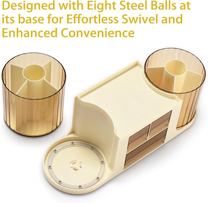 Rotating Desk Organizer with 2 Pen Holder, Desk Organizers and Accessories with 10 Slots Pencil Holder for Desk + 3 Drawer, Art Supply Storage Box Caddy for Office School Home (Beige)