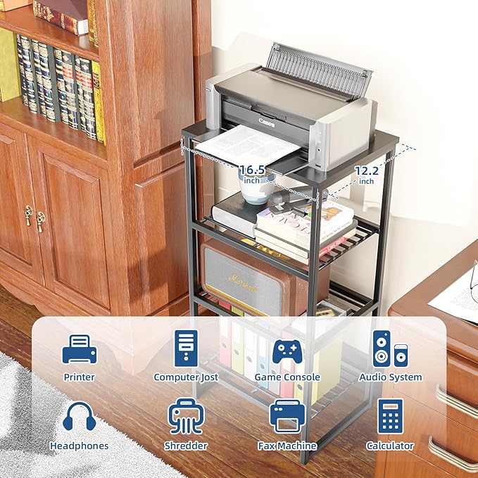 - 【Ideal Size for Printers 】Dimensions: 16.5''W x12.5''D x32.5''H - Perfect size for elevating printers, fax machines, scanner or small laser jet on the top shelf. This tall side table fits in every corner of the room! It is designed as a office printer table, sofa side table or small nightstand, storage shelf, etc.