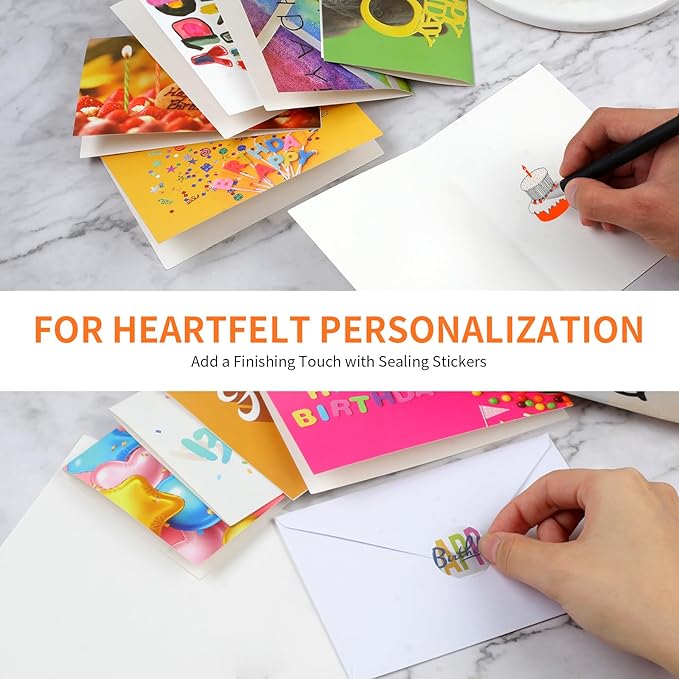 - PRODUCTS INCLUDED: 32 beautiful birthday cards are 4 "x 6" in size, paired with 32 white self-sealing 4.2 "x 6.2" envelopes and 32 polka dot stickers in different patterns with a diameter of 1.2in, no additional sealing tape required, enough to meet your daily use. Happy Birthday cards bulk is unrolled by default, and the fold marks of the cardstock are pre-printed, so you don't have to worry about being unable to fit the cardstock into the envelope due to improper folding.