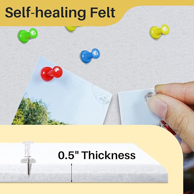 - High-Density Felt Board: Our cork bulletin board features a high-density 1/2 inch thick felt construction that holds up against multiple nailing without visible holes, and push pins will not go through your corkboards or break your wall, durability and longevity