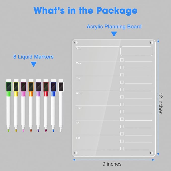 - What's in the Box: one 12''x9''transparent acrylic fridge weekly planning board, 8 markers. This fridge weekly calendar dry erase magnetic & weekly planner for metal fridge is perfect Mother's Day/New year/Christmas/Father’s Day/birthday gift ideas for Back to School / Off to College / friends, families, office work, colleagues, mother/mom, father/dad, party decorations supplies.