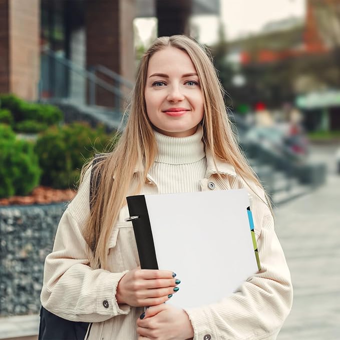 - 【Binder with Dividers】This notebook with dividers and pockets comes prefilled with 30 pieces of 8.5"x 11" college ruled paper, 30 graph papers, 5 colored tabbed dividers with pockets, and 1 movable pouch. This 3-ring notebook's dimensions are 11.6" x 10.4". Normally, in back-to-school season, you need to buy 5 subject notebooks and 1 binder, but now, with this all-in-one notebook, you only need to bring one, which can greatly save your backpack space.
