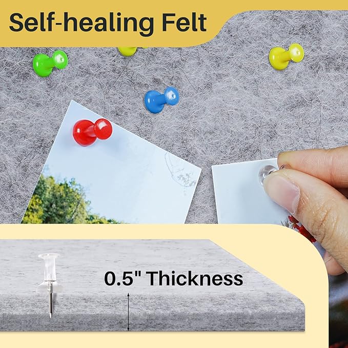 - High-density Polyester Fiber: Safe material designed of the felt board to endure multiple nailings without leaving visible holes. The 0.5-inch thick wall tile can hold push pins without piercing the board or wall