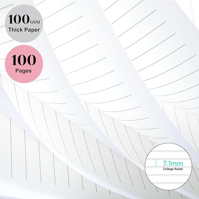 - 100 GSM High-quality Paper -- This college ruled notebook uses 100gsm premium acid-free paper, 7.1mm, which is thicker than traditional paper, can write on both sides, no ink feathering and bleeding. Suitable for most pen types. 50 sheets/100 pages lined paper, It can provide you with a lot of creative space.