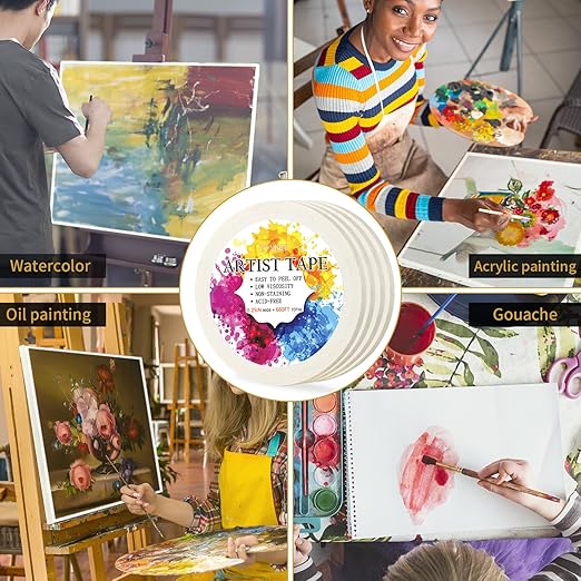 - 【Easy Peeling】The artist tape for watercolor paper is made of crepe paper, it can be torn apart by hand with gentle force. The white tape with low viscosity features that is easy to peel off without any damage to the watercolor paper. More efficient and convenient for painter. Please don't stick/peel this tape on/off paper with a intended strong strength. It is recommended to use in the temperature range of 8-38°C for the best effect. Not recommended for use at temperatures below 0°C. Too low temperature would make the adhesive of the tape low. Too high temperature would cause residue.