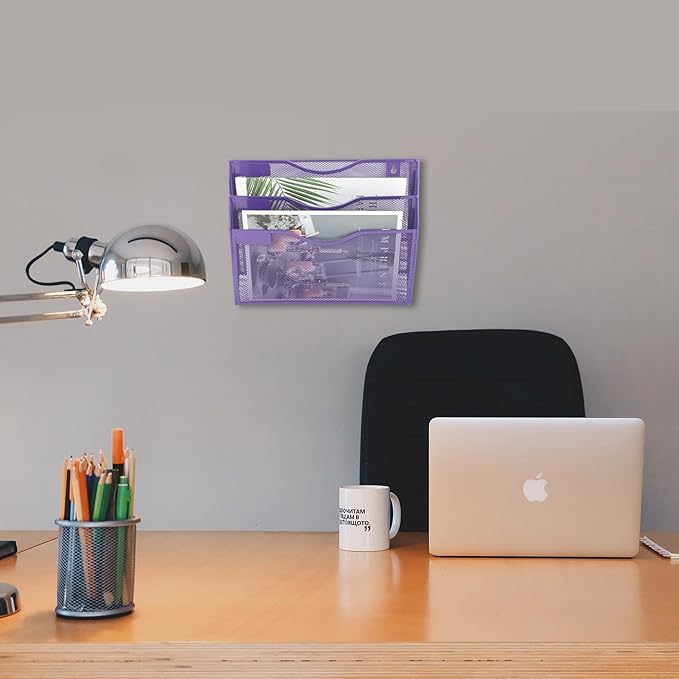 EASEPRES 3 Pocket Mesh Hanging Wall File Organizer, Wall Mounted Mail Paper Document Folder Holder, Clipboard Storage Organization Magazine Rack with Nametag Label for Office School Home, Purple