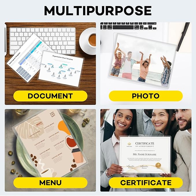 - Application:Perfect for protecting certificates,signs,photos,awards,calendars,kids artworks. It can seal and protect your documents it can be used in classroom, home and office. Compatible with all thermal laminator machine brands. Thermal laminator needed, not self-adhesive
