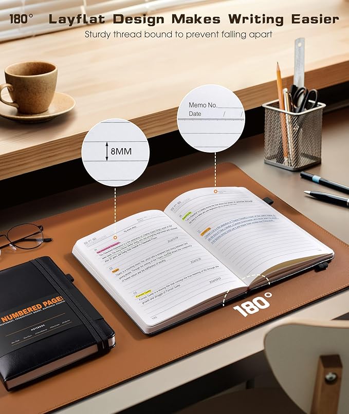 - 【180° Lay Flat Design】The 180° lay flat design, combined with a sturdy thread-bound binding, the leather notebook can easily to lay out flat makes taking notes more efficient, reading more convenient, which provide a comfortable writing experience. Rounded corner design makes the lined notebook not easy to be damaged and curled. Standard 8mm space classic college ruled journals, each journal page has “Memo No” and “Date” header to help you keep track of the date.