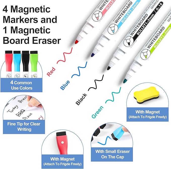 - 【Versatile White Board】- The magnetic whiteboard is the great helper for home, school, and office organizer. Maximize your creative potential and make it as multifunctional as you want, for example, you can draw, count, create your weekly or daily to-do lists, schedules, notes, shopping lists, grocery lists, weekly meal planner, menu, chore lists, message reminders, and some activities, notes, reminders, appointments, tasks, parties and weather conditions. and more.