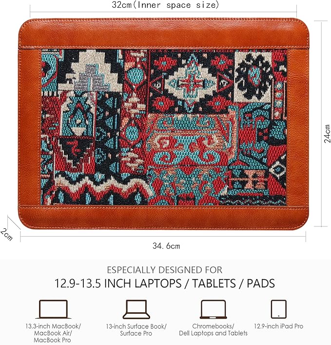 - [Material]-The Laptop Case Made of Jacquard cloth and leather, soft plush lining - anti-static, can effectively absorb shock, reduce damage caused by accidental collisions, and protect the notebook from scratches.