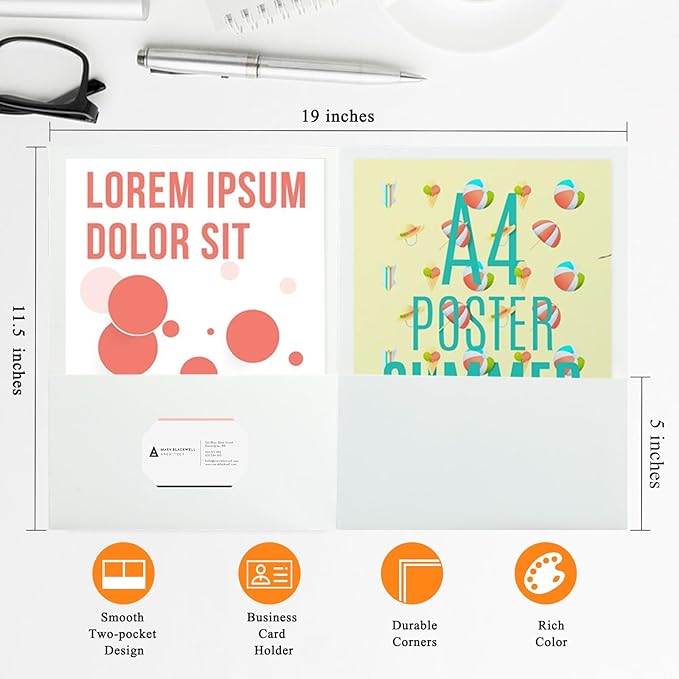 - KEY FEATURES:Two pocket folders with 5" pockets, Each pocket can hold up to 50 sheets,But can even handle more.Four-corner business card holder eliminates popout