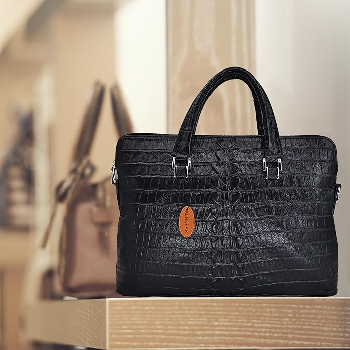 - 【MATERIAL AND DIMENSIONS (L*W*H)】:14.56" * 1.96" * 11.02" / Weight: 2.4lb. Genuine Leather--The leather computer bag is made of soft first-layer cowhide leather with a crocodile pattern texture and polyester lining. This leather handbag is a high-quality fashion accessory with style and durability.