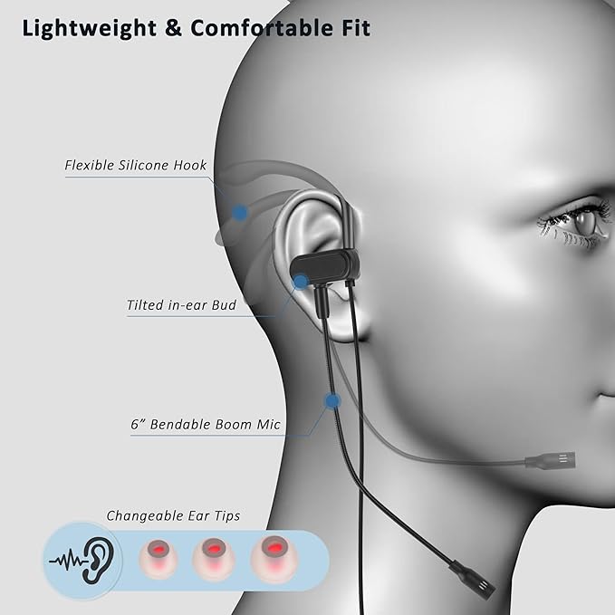 - ONE-SIDE HEADPHONE - This small in-ear headphone with detachable boom mic offers a better alternative to traditional single headset. Without a heavy headband or sweaty earpad, this mono headphone with mic is compact, lightweight, and comfortable. [For right-ear wearing only!]