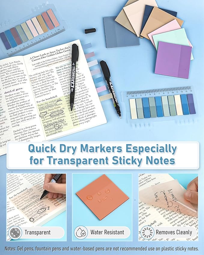 - Annotation kit: Including 12 colors clear sticky notes and 30 colors index labels, along with 2 dual ended quick dry markers, ensuring your notes clear and not smearing. The sticky notes pads and index tabs adopt quality PET material, waterproof, durable, and will not leave any residue on the page, you can be written on the information and paste it wherever you want