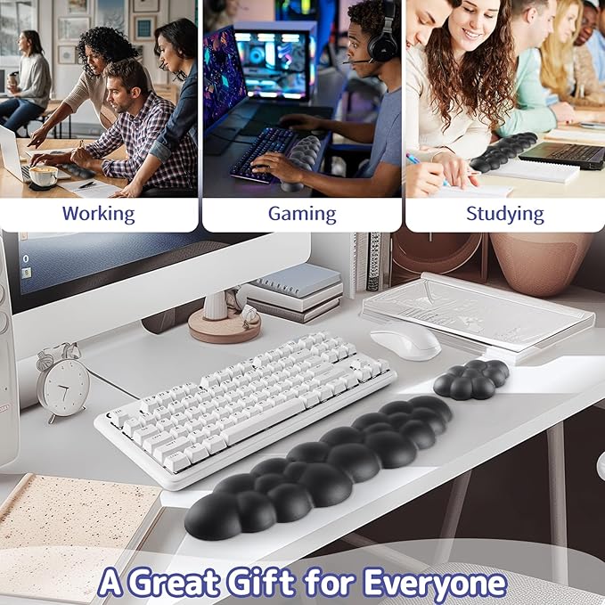- Cloud Soft Comfort: Premium 63D high-density memory foam and new soft breathable leather fabric, fits the skin and is super comfortable. This cute and squishy cloud keyboard pad with wrist support is durable and contoured perfectly for you. It is a perfect desktop companion for gaming and office