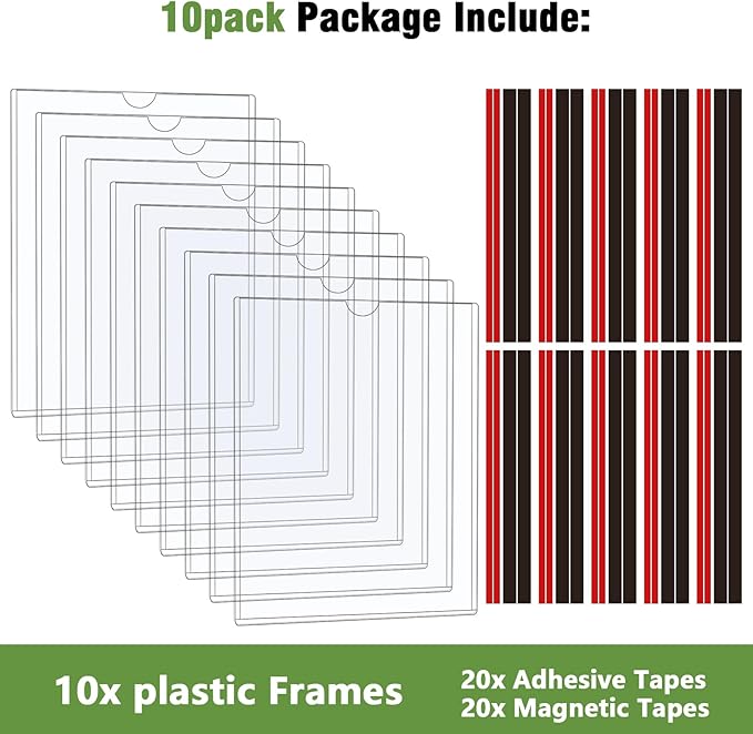 - ✔ 【Easy to Assemble】 The sign holder offers multiple installation options: use the included adhesive tapes to stick it on the wall, magnetic strips to attach on a refrigerator or blackboard, or simply use it as a rigid print protector without any tapes. No drilling required, ensuring a hassle-free setup.