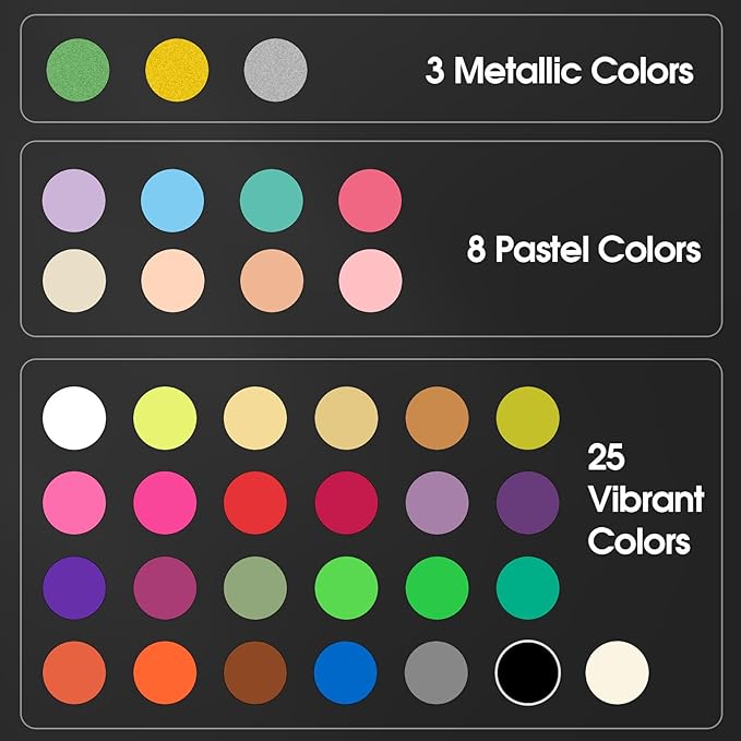 - 36 Colors: We offer 36 different colors, including 3 metallic colors, 8 pastel colors and 25 Vibrant Colors.Choose different colors for your writing and drawing needs.