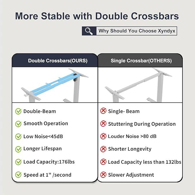 - 【Superior Stability】----- Double crossbars are more stable than single crossbars. The stability of Xyndyx lifting tables and the durability of the motors have been tested over 20,000 times to ensure you receive a high-quality product that lasts. The operating voltage of the adjustable desk frame is 110V-220V.