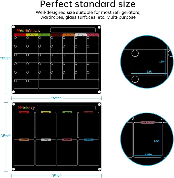 - 【Magnetic Dry Erase Calendar Kit】 Acrylic Weekly and Monthly calendar dry erase plan board kit, includes 6 dry-erase markers,magnetic pen holder, and a cleaning cloth . The calendar board records your daily plan to keep you life and work organized.