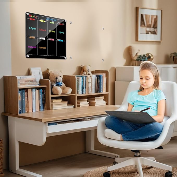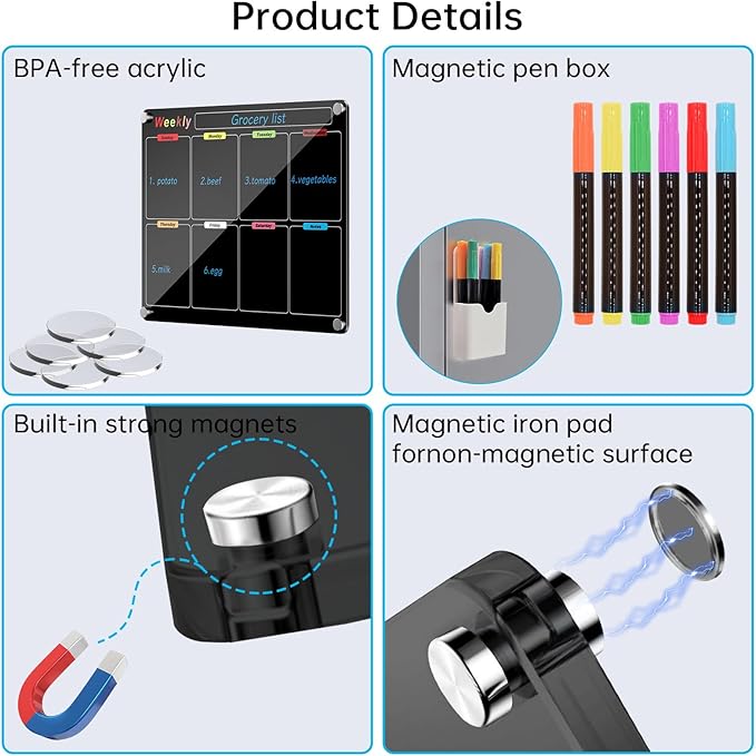 - 【Effortless Writing & Enhanced Clarity】 With four vibrant markers in 6 colors, you can smoothly jot down your daily plans on the magnetic calendar board and conveniently organized them in the magnetic pen case when not in use. Paired with the sleek black acrylic calendar board ensures a clear clarity and visibility.