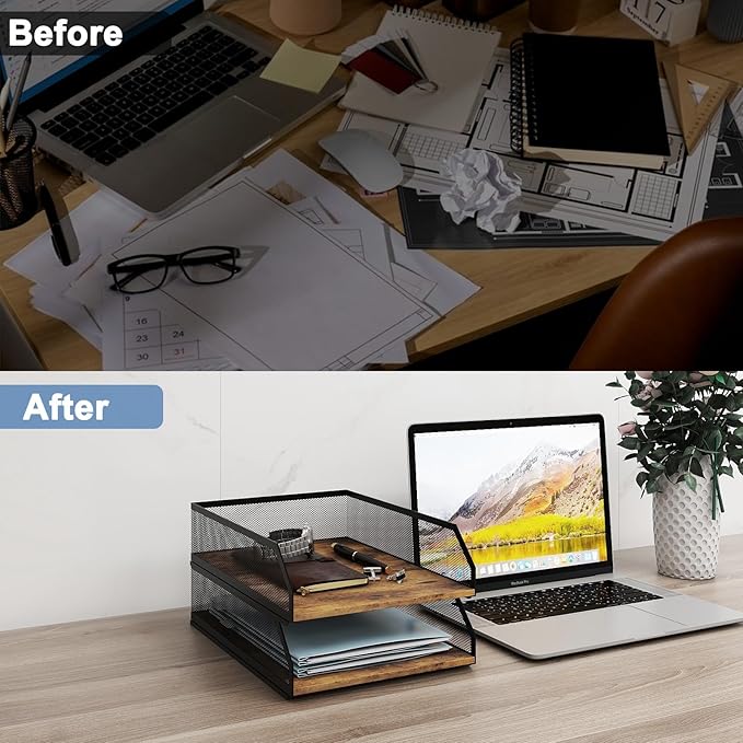 - 【Durable & Sturdy】The 2 tier desk organizer is made of high-density metal mesh, and thick wood board tray. Reasonable structure, strong and durable paper tray.