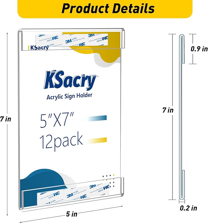12 Pcs Acrylic Sign Holder 5 x 7, Vertical Wall Mount Sign Holders with 3M Adhesive, Clear Plastic Frames Paper Display Sign Holders for Office, Home, Store, Restaurant - No Drilling