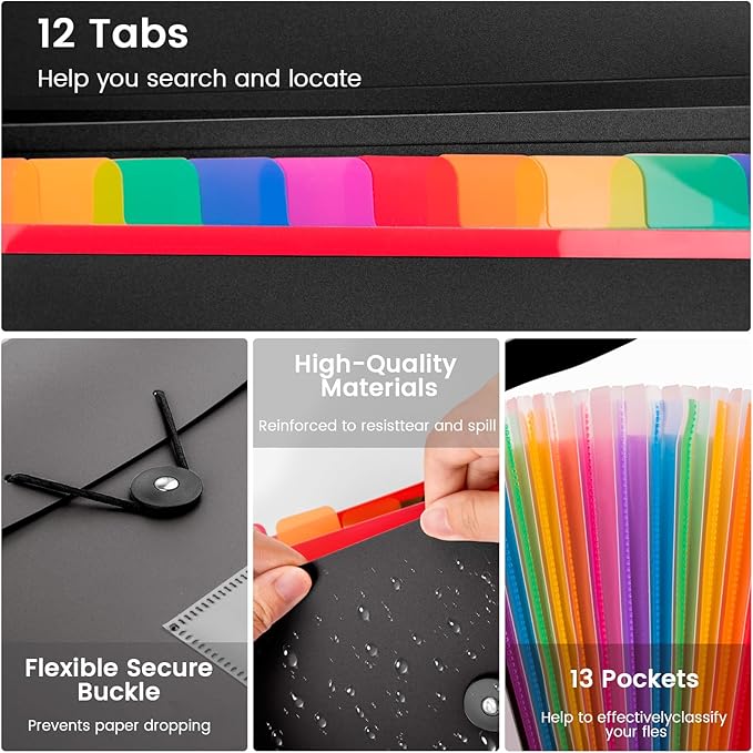 - 【6-PACK EXPANDING FOLDER】13-pocket accordion file folder, available in six vibrant colors: black, blue, blue-purple, purple, yellow, and pink, ensures efficient organization by subject, securely storing all your essential documents for easy access