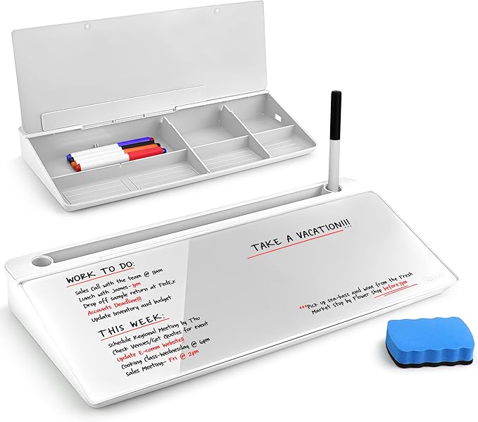- SAY GOODBYE TO CLUTTERED DESKS - Say hello to efficiency with a dry erase desk organizer that has 5 large storage compartments. Use our dry erase desk pad to jot down important reminders, keep track of your tasks, & more to keep your mind sharp thanks to an organized space.