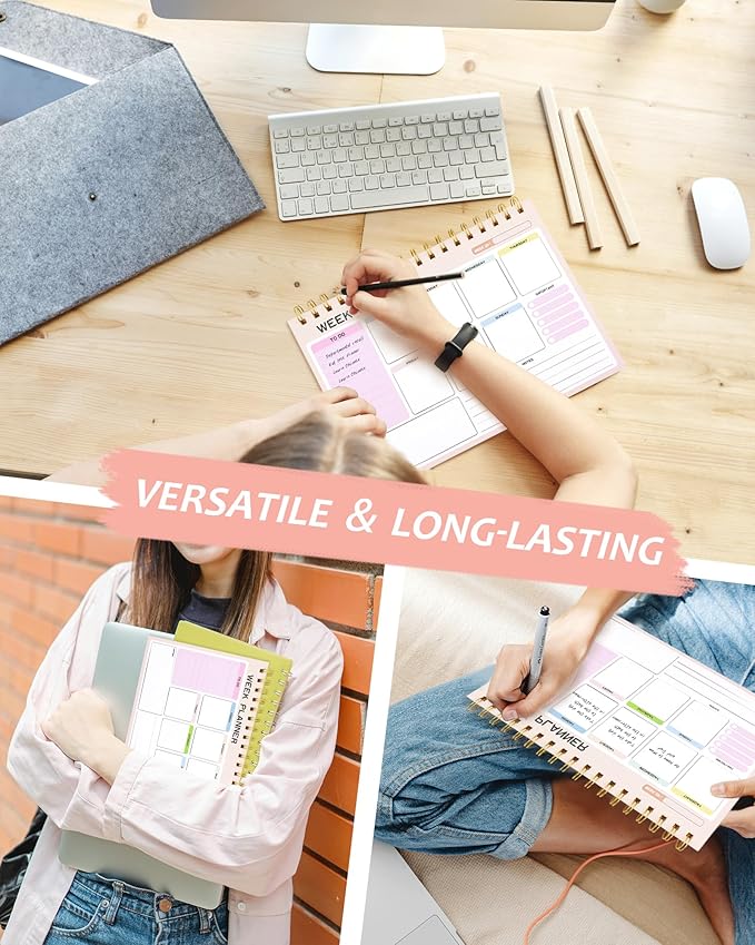 - 【Functional Design】: Our undated daily planner notepads features premium quality covers and twin-wire binding, providing durability and flexibility for smooth page-turning. The sturdy cardboard backing ensures stability on any surface, making it a reliable companion for your daily tasks.