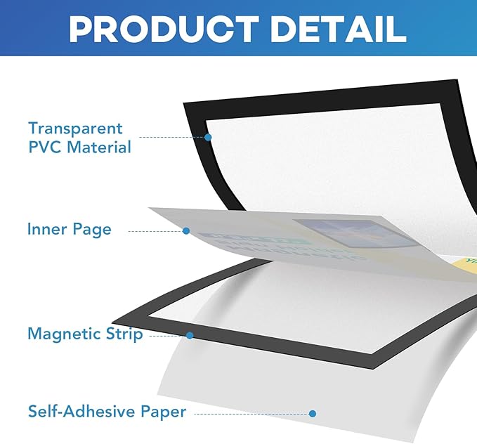 - 【Clear PVC Surface】The surface of the magnetic sign holder is made of transparent PVC material, which can show the inner pages clearly. It is waterproof, dustproof, sunproof and not easy to turn yellow. It can also be read on both sides when used on glass windows.