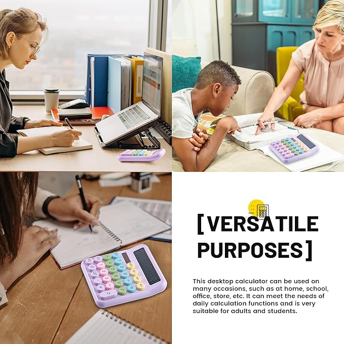 - [CUTE CALCULATOR] This desk-purple mechanical calculator has a large 12-digit display, large buttons, and dual power supplies (solar and battery), making your work easy and enjoyable.