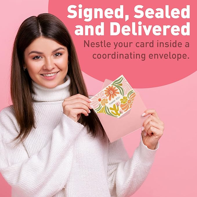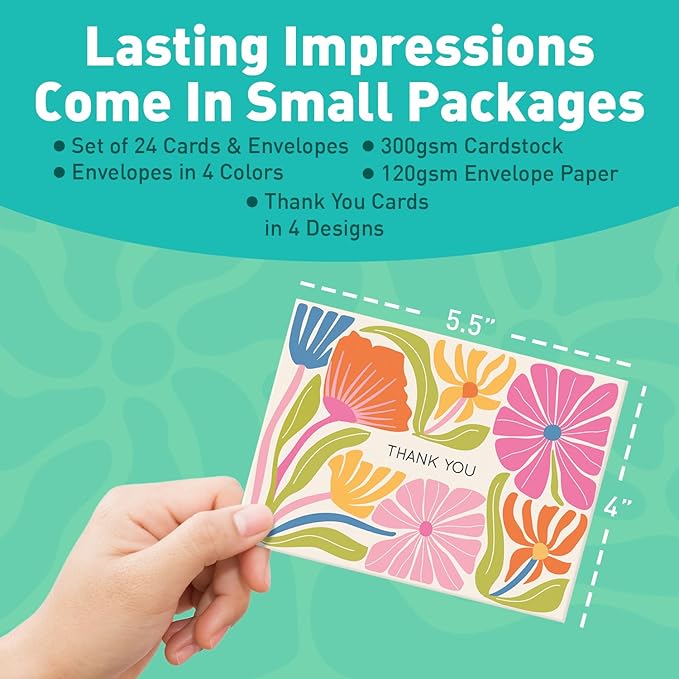 - Two-In-One Set — No more boring white envelopes. This thank you card pack of 24 introduces eye-catching palettes of color from the moment they receive your thanks. These blank thank you cards with envelopes keep your stationery drawer fully-stocked for important events