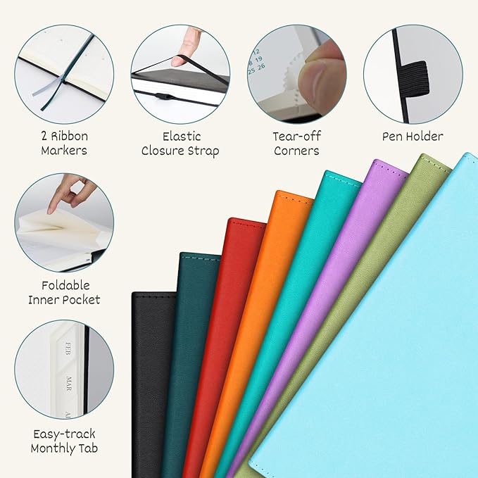 - THOUGHTFUL DESIGN - Handy structures for convenience. 2 Ribbon Markers | Elastic Closure Strap | Inner Pocket | Easy-track Perforated Corners | Pen Holder | Date Countdown