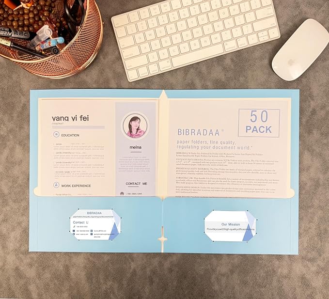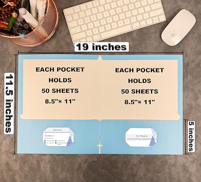 BIBRADAA® 50 Packs Blue Folders with Pockets,File Folder with Pockets Fit Letter Size Paper,File Folders Letter Size,Durable Paper Folders for School, Office, Business. (50, Light Blue)