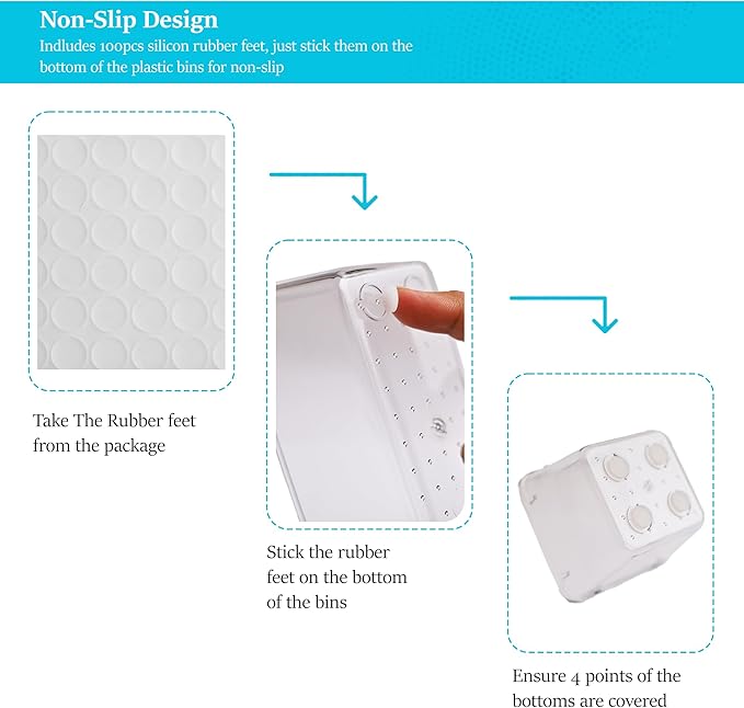 - 【𝗞𝗜𝗧𝗖𝗛𝗘𝗡 𝗢𝗥𝗚𝗔𝗡𝗜𝗭𝗘𝗥 𝗡𝗢𝗡-𝗦𝗟𝗜𝗣 𝗕𝗢𝗧𝗧𝗢𝗠𝗦】These clear plastic storage bins feature a non-slip bottom to prevent sliding ensuring stability when opening and closing drawers. This set includes non-slip stability. Take the rubber feet from the package and stick the rubber feet on the bottoms of the makeup storage organizer to ensure 4 points of the bottom are covered.