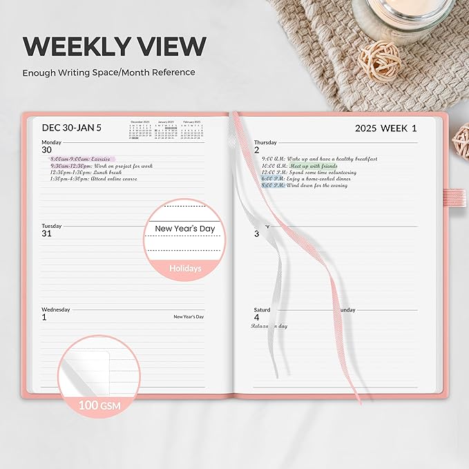 - Weekly View - 2-page weekly spread from Monday to Sunday provides generous lined writing space along with popular holidays and month reference previews, allowing for easy appointment, note, and daily task management.