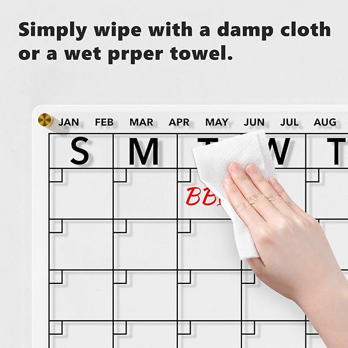 - Easy To Wipe & Reusable: The clear acrylic calendar has a stain-resistant surface; You can erase countless times without any smudgy ghosting or staining; Use the marker cap to wipe or just use a wet towel to wipe.