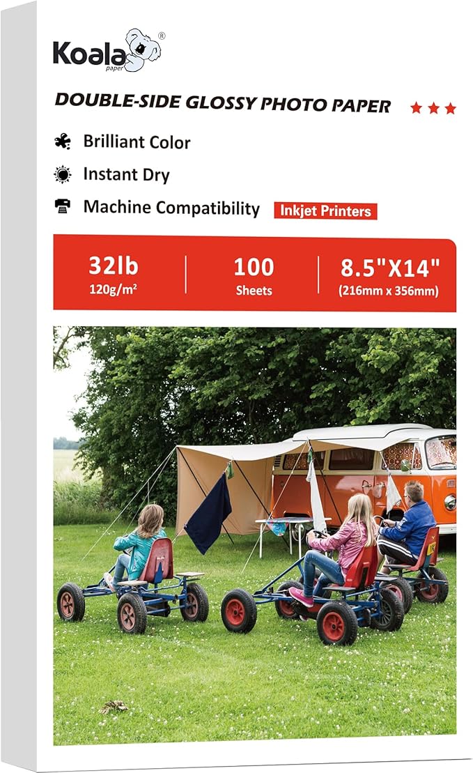 Koala Double Side Thin Glossy Photo Paper 8.5x14 Inches Legal Size 120gsm 100 Sheets Compatible with Inkjet Printer and Dye Ink 32LB