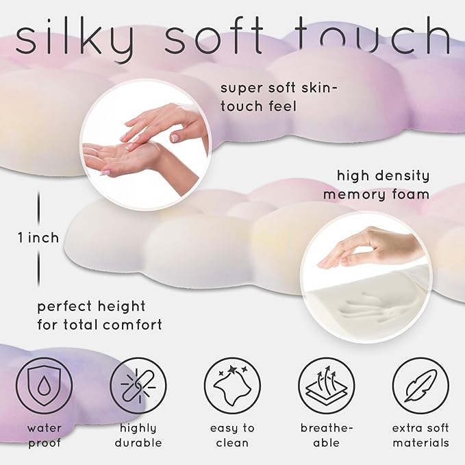 - CLOUD SOFT COMFORT - A premium high density memory foam cloud wrist pad arm rest for keyboard with a new soft-touch breathable material that is ultra comfortable against your skin. This cute and squishy cloud keyboard pad with wrist support is durable and contoured perfectly for you. A keyboard hand rest that is the perfect gaming keyboard wrist rest with wrist support for keyboard rest wrist pad. A super comfy desk wrist rest cloud desk pad
