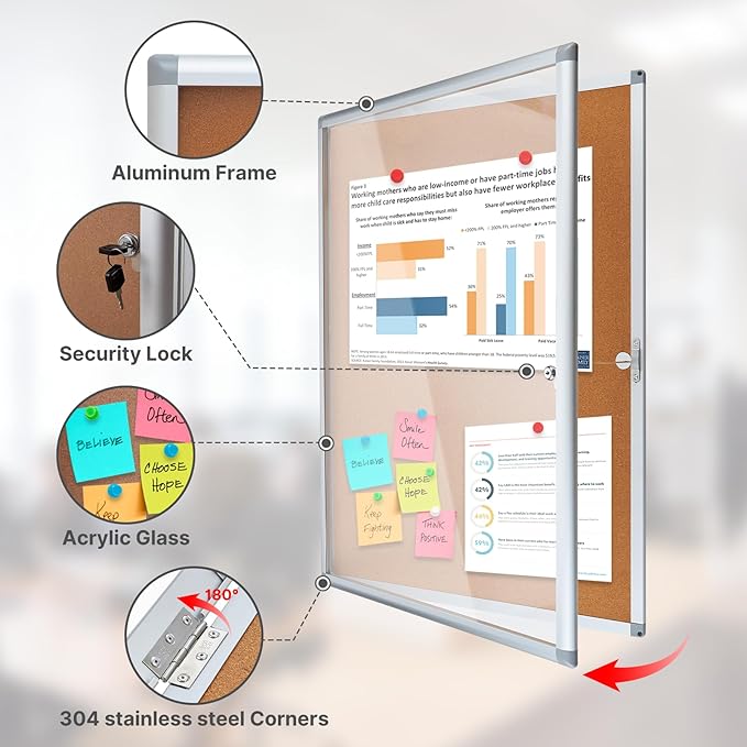 - Secure and Protected Display Lockable Glass Doors: Our enclosed bulletin board features lockable glass doors and key mechanisms, ensuring that important information remains safe from the elements, theft, or tampering.