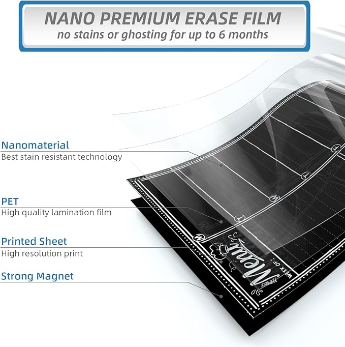 - DRY ERASE: With nano premium erase film, it will be a breeze to wipe off the writings even after several months; it’s not going to leave any stains; it’s waterproof, so you can clean it with a wet cloth if you want