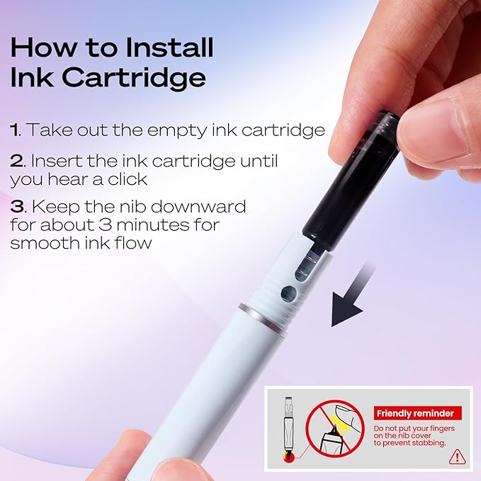 - Fine nib black ink, 1 retractable fountain pen includes 5 cartridges