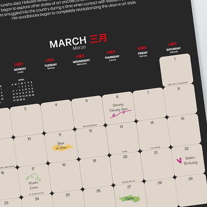 - 2025 Calendar - Includes a free poster of a famous painting by Katsushika Hokusai (located as a centerfold - after June and July). The wall planner includes 12 specially designed images for each month of the year, full of colours and originality. Keep your room's positive energy and surprise your friends with this perfect gift
