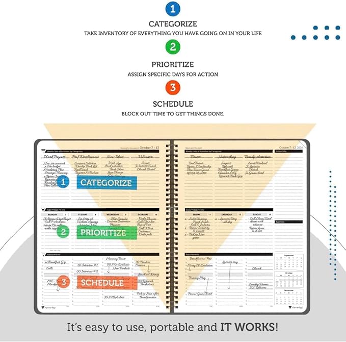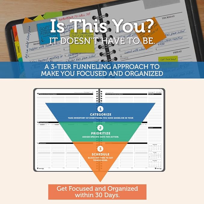 - SINCE 1974 EXCLUSIVE 3-TIER FUNNEL DOWN approach helps you prioritize and organize all that matters. Section 1- CATEGORIZE is to inventory everything you have going on. Section 2 - PRIORITIZE items from section 1 to specific days for attention. Section 3 - SCHEDULE is to block out time for tasks from section 2