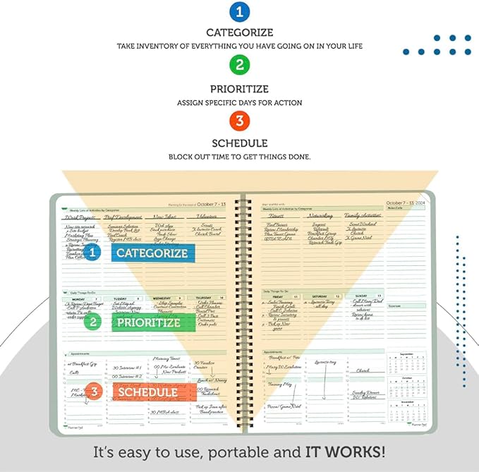 - SINCE 1974 EXCLUSIVE 3-TIER FUNNEL DOWN approach helps you prioritize and organize all that matters. Section 1- CATEGORIZE is to inventory everything you have going on. Section 2 - PRIORITIZE items from section 1 to specific days for attention. Section 3 - SCHEDULE is to block out time for tasks from section 2