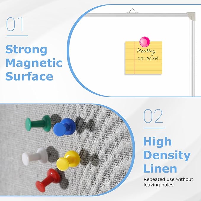 - Magnetic & Double sided surface: This whiteboard combo has a strong magnetic surface, with our included magnets, you can post documents, photos, etc. on the board. This big white board is also double sided, greatly increasing writing space to release your full inspiration.