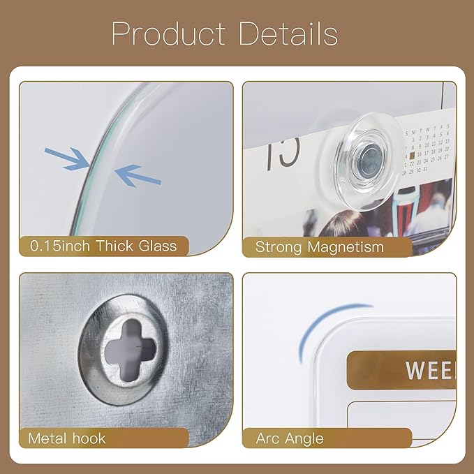 - 🧲【TEMPERED GLASS & MAGNETIC】 Made of 0.15inch Thick Tempered Glass, high strength and explosion-proof. The magnetic glass surface design allows you to hold some photos, papers, etc. and also use refrigerator magnets to decorate your glass board. We are equipped with 2 strong magnets.