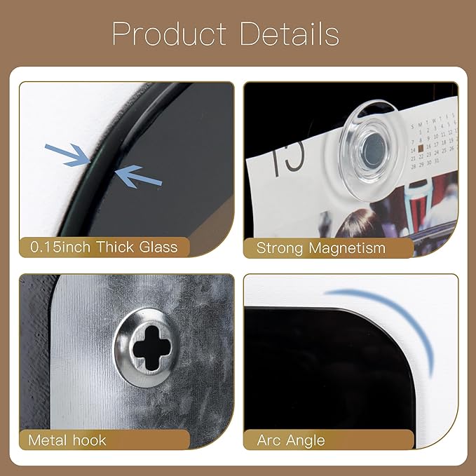 - 🧲TEMPERED GLASS & MAGNETIC: Made of 0.15inch Thick Tempered Glass, high strength and explosion-proof. The magnetic glass surface design allows you to hold some photos, papers, etc. and also use refrigerator magnets to decorate your glass board. We are equipped with 2 strong magnets.
